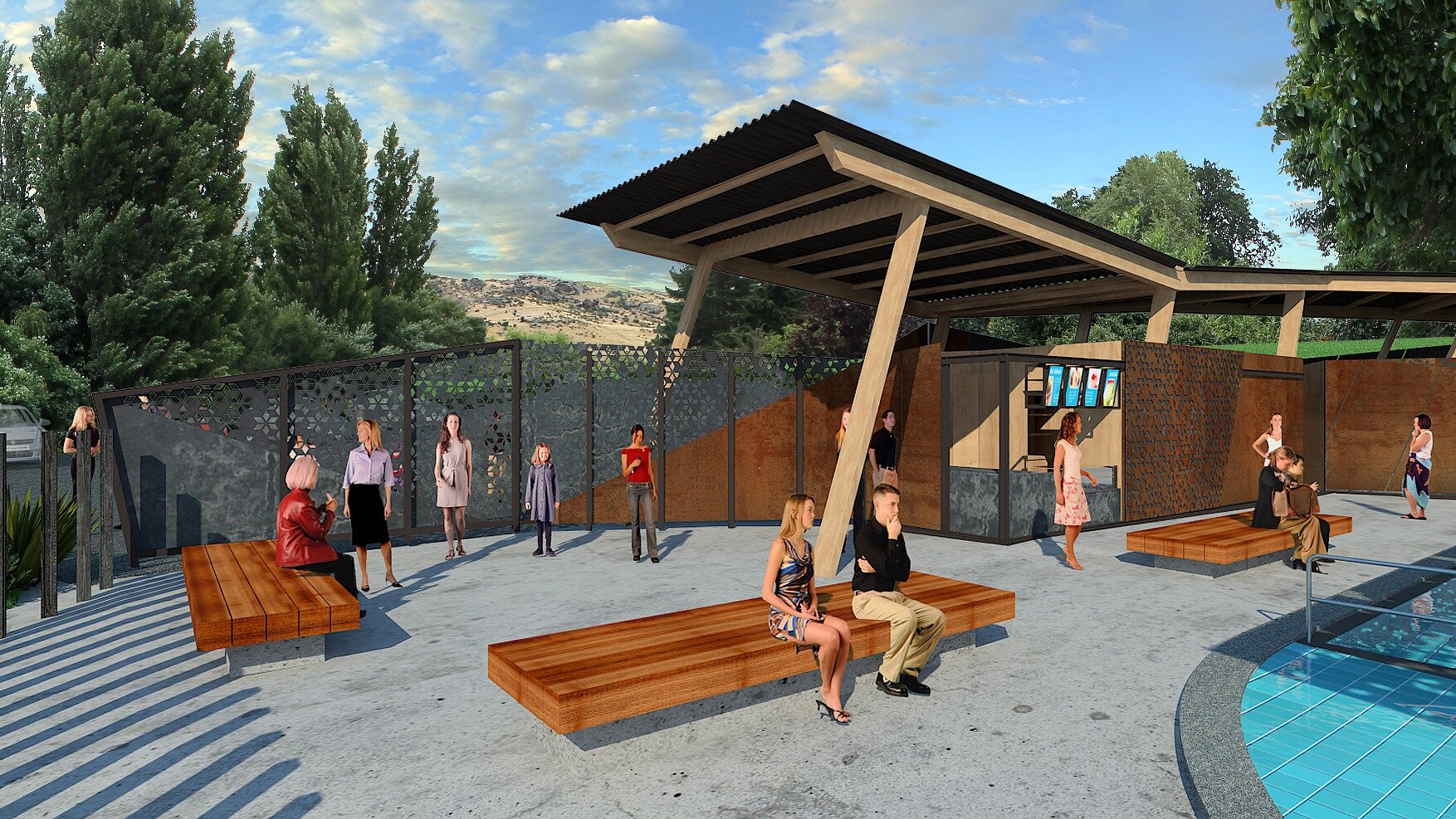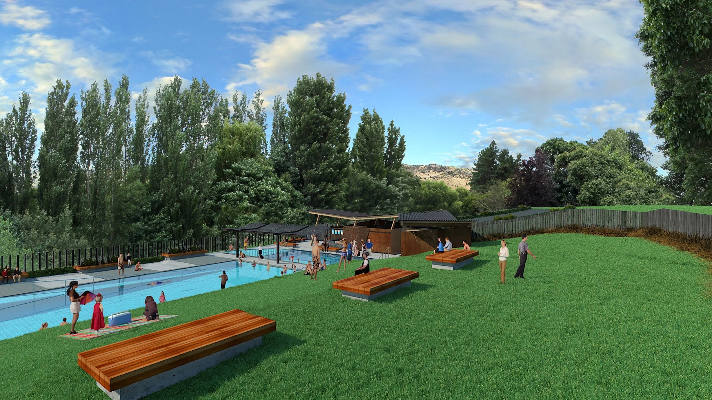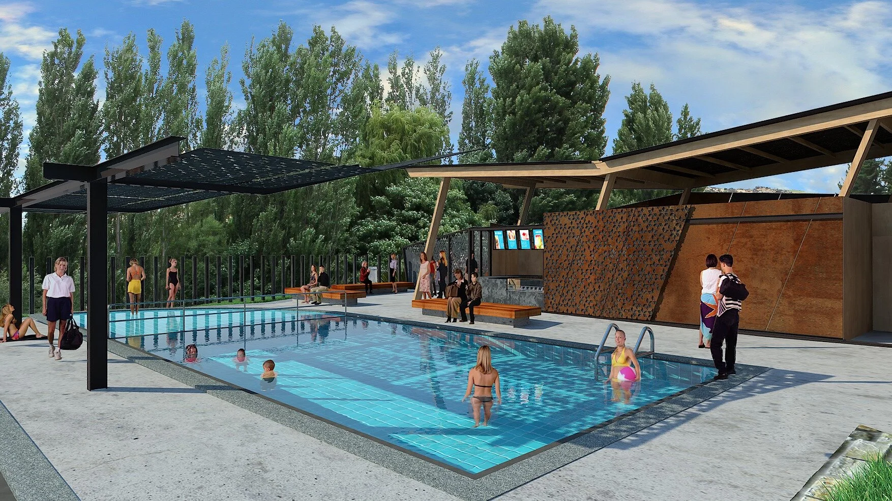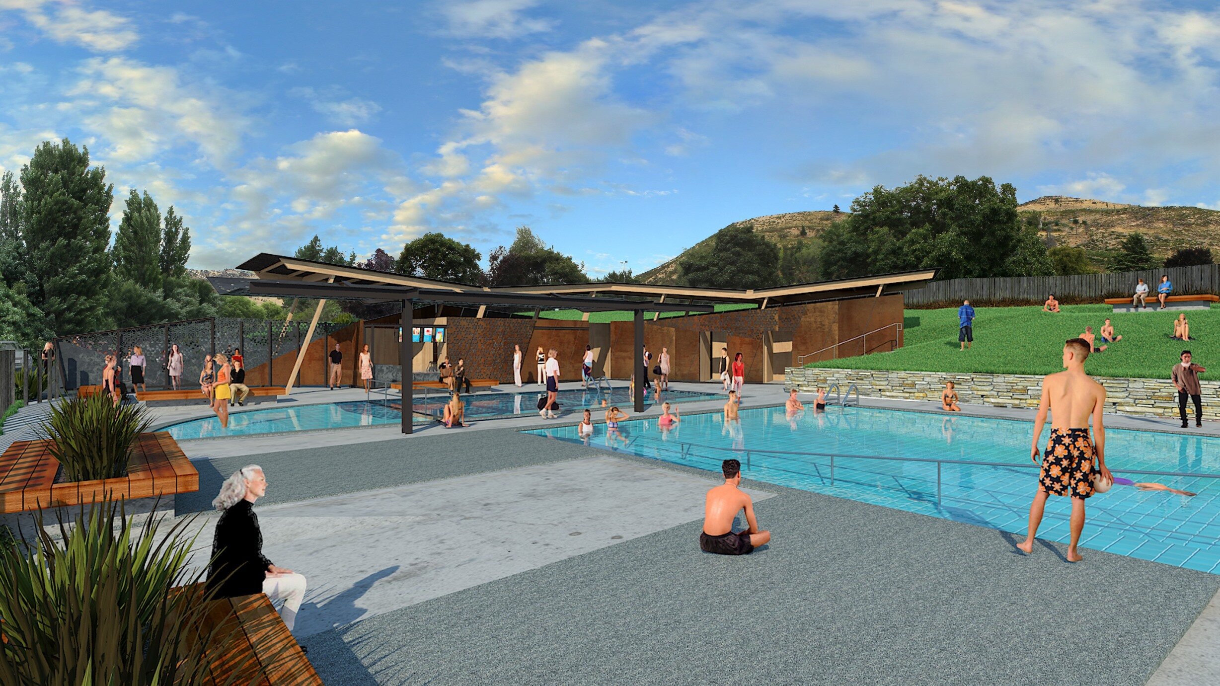 Proposed facilities include a 25m swimming pool, shaded 10m learner pool, 5m quadrant beach entry pool, raised seating, paved pool sides, family change areas and ablutions, separate male and female change and ablutions, covered eating area, slide, grassed banks with raised seating, office accommodation and café with deck style seating areas overlooking the pool.